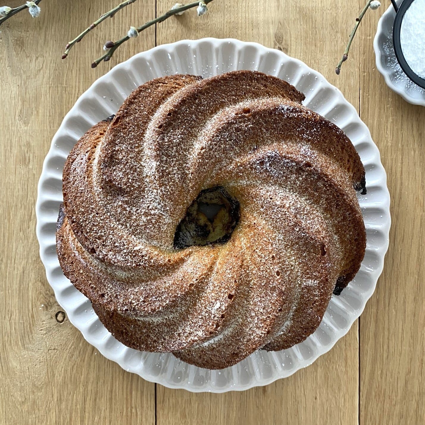 - Babkę posyp cukrem pudrem.