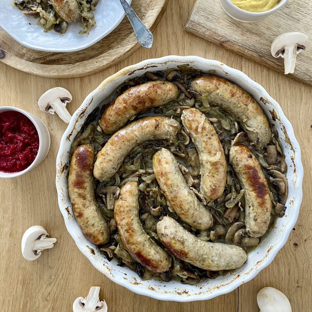 Biała kiełbasa z cebulą i pieczarkami
