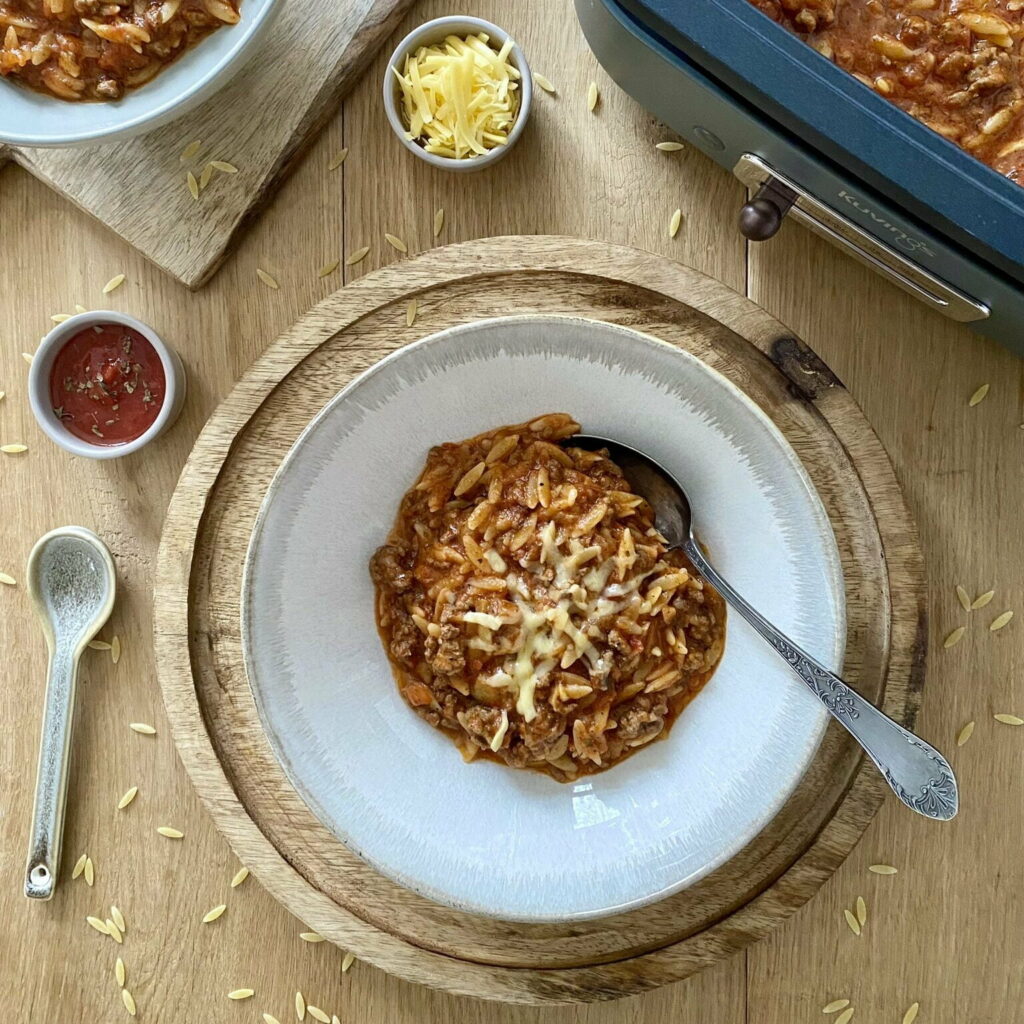 Jednogarnkowe danie z mięsem mielonym i makaronem orzo.
