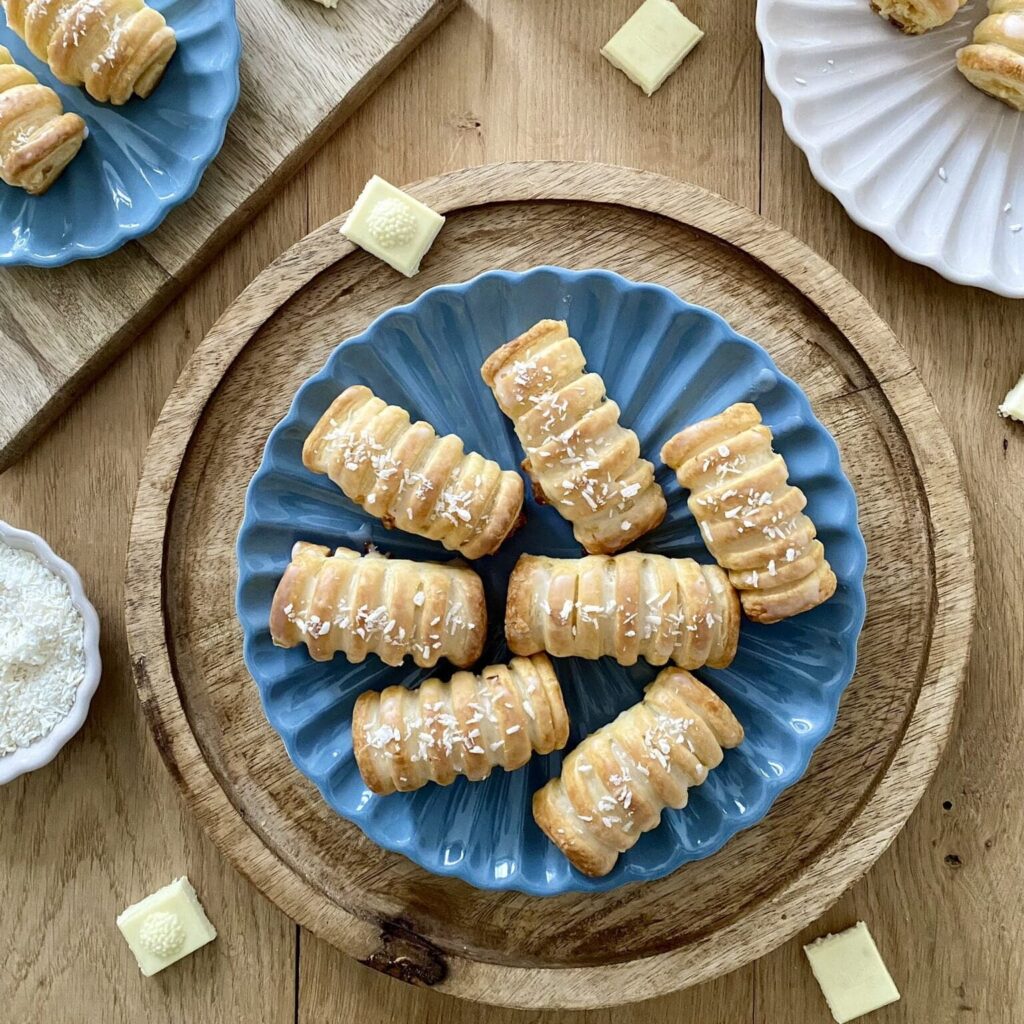 Ciastka z ciasta francuskiego z białą czekoladą i wiórkami kokosowymi.