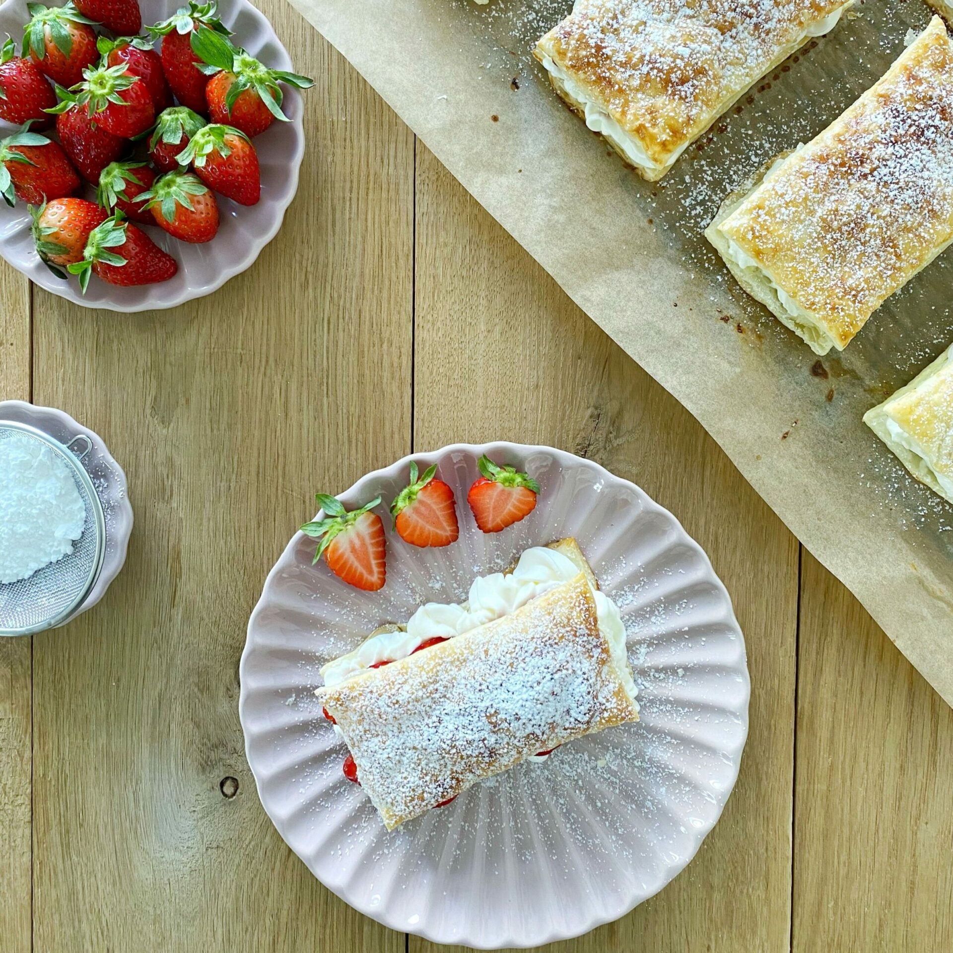 - Gotowe ciastka francuskie przekrój na pół, nałóż bitą śmietanę, plasterki truskawek, przykryj górną częścią ciastka i posyp cukrem pudrem.