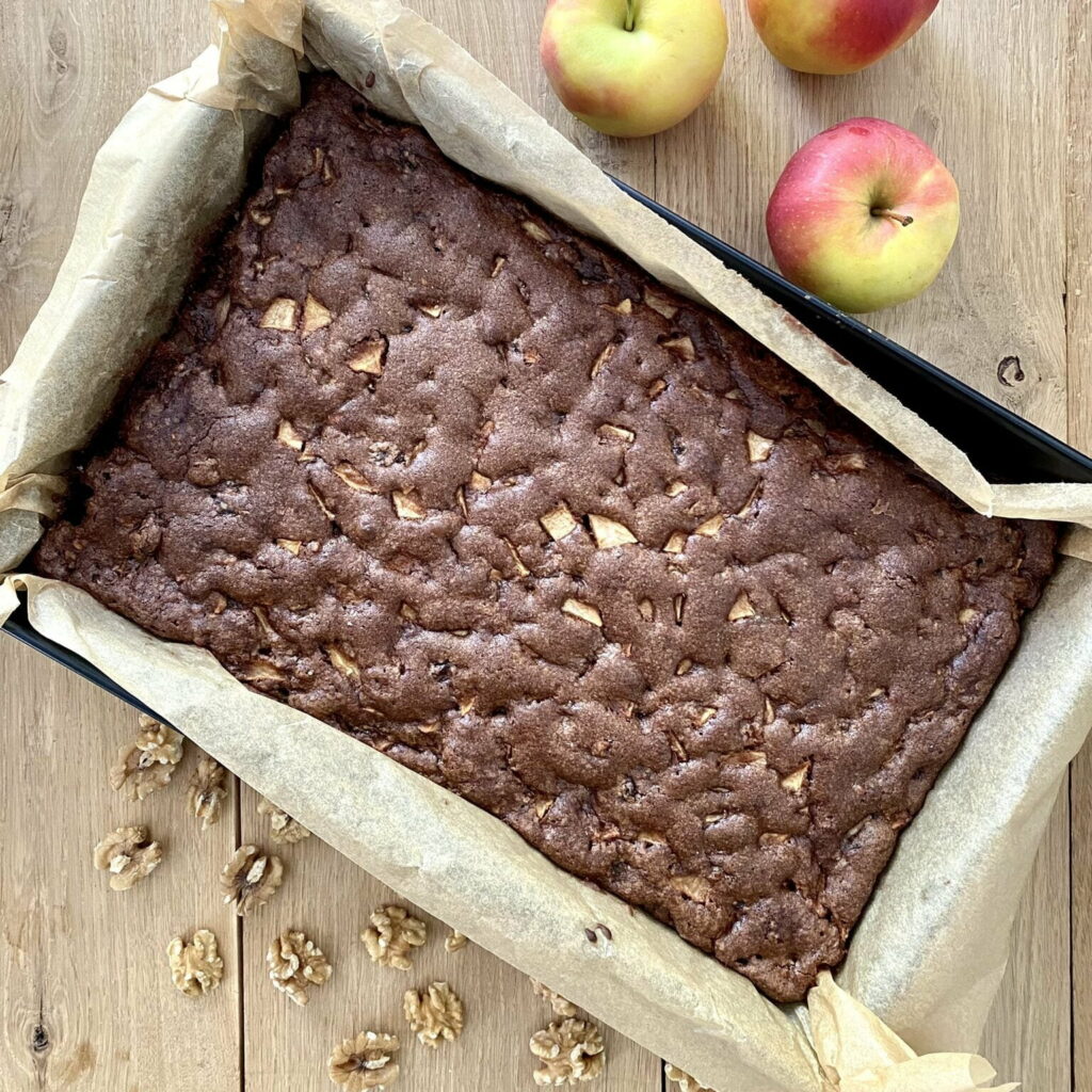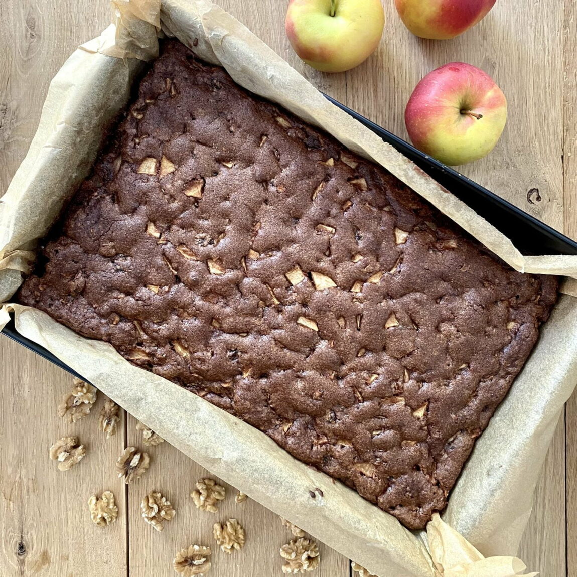 Bardzo łatwe i szybkie do zrobienia ciasto z orzechami włoskimi, rodzynkami, jabłkami i kakao.