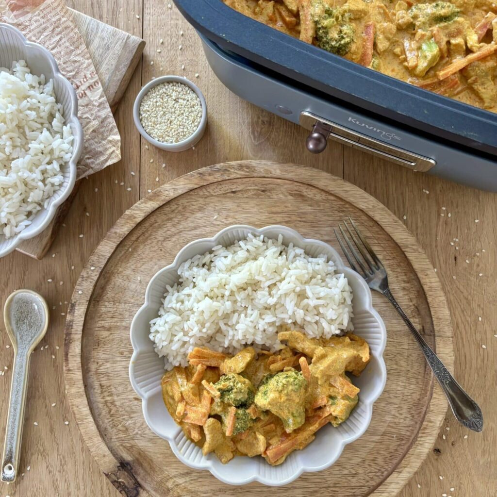 Kurczak curry to aromatyczne i sycące danie inspirowane kuchnią indyjską. Soczyste kawałki kurczaka duszone w kremowym sosie curry doskonale komponują się z marchewką i brokułami, tworząc pełnowartościowy posiłek. To szybki i prosty sposób na obiad pełen smaku i przypraw. Podawany z ryżem zachwyci każdego miłośnika orientalnych dań.
