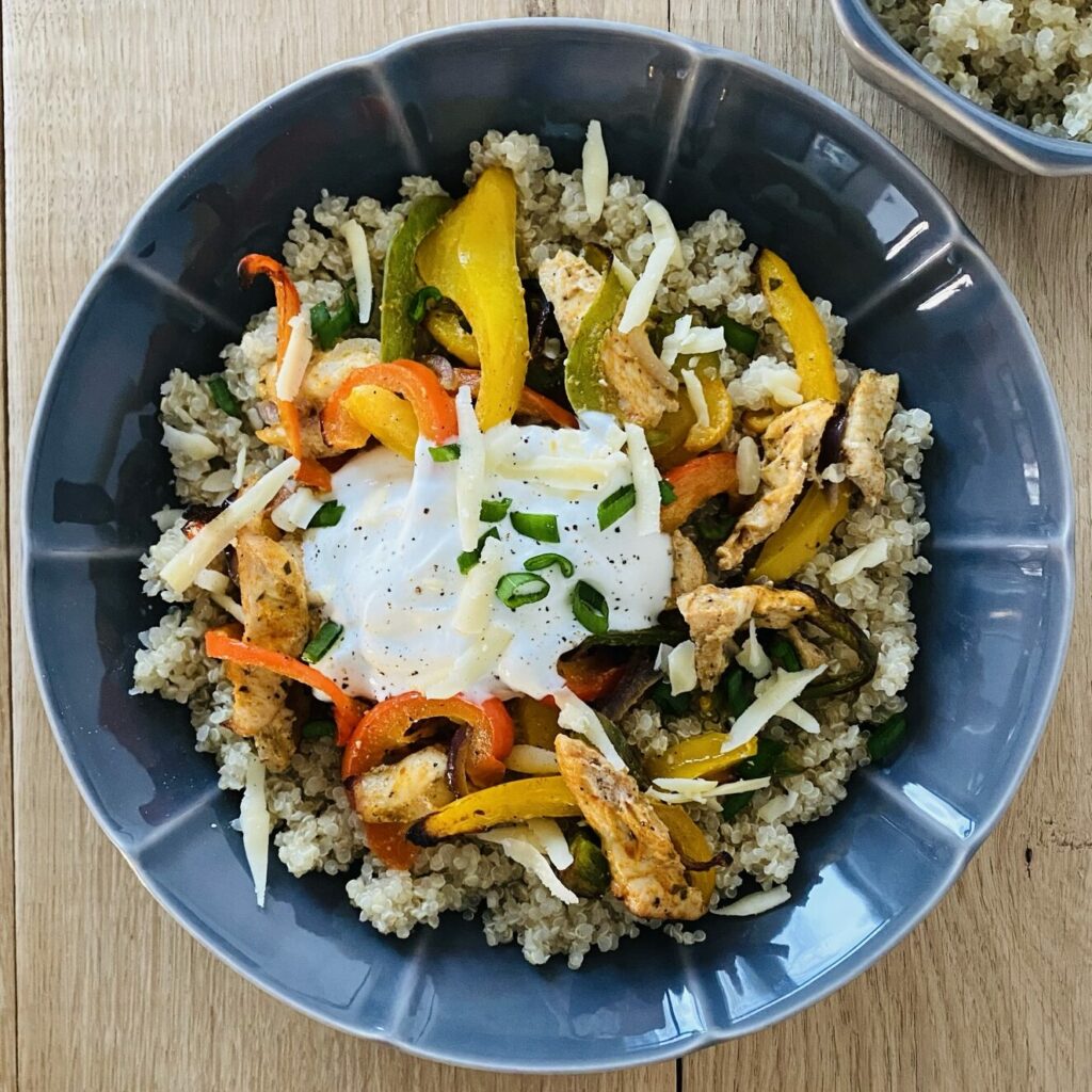 Fajitas z kurczakiem i komosą ryżową to smaczne danie o korzeniach meksykańskich, które łączy w sobie różnorodne smaki. Soczyste kawałki kurczaka wraz z kolorowymi paprykami marynowane w aromatycznych przyprawach, takich jak papryka chilli, kmin, czosnek, oregano, nadają potrawie głęboki smak. Lekka komosa ryżowa stanowi idealne uzupełnienie całego dania. To danie nie tylko smakuje wybornie, ale także przyciąga uwagę swoim kolorowym i apetycznym wyglądem, doskonale pasując na meksykańskie przyjęcie czy wspólny posiłek z przyjaciółmi.