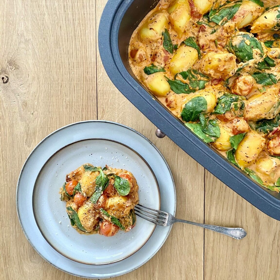 Gnocchi w kremowym sosie ze szpinakiem i pomidorkami koktajlowymi to szybkie, jednogarnkowe danie.