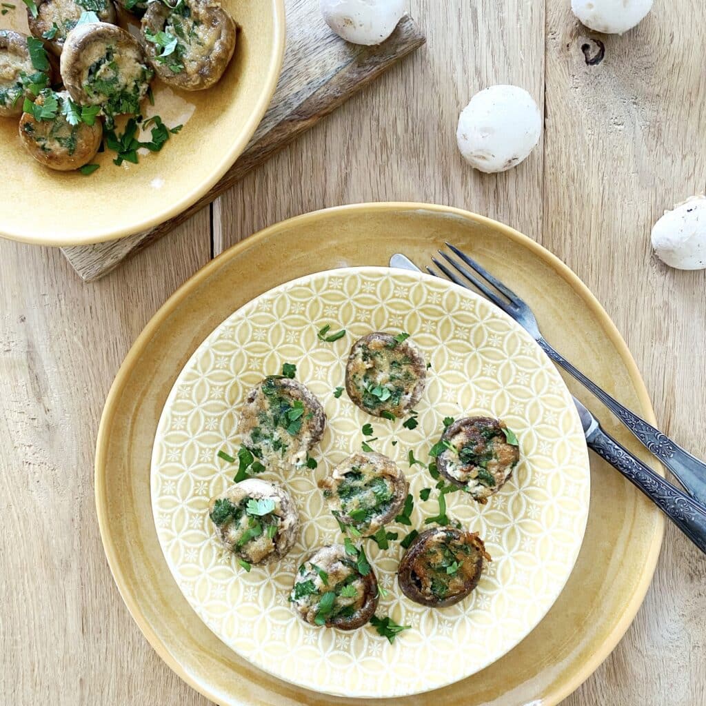 - Gotową masą napełnij pieczarki i grilluj kilka minut, aż do uzyskania złocistego koloru.