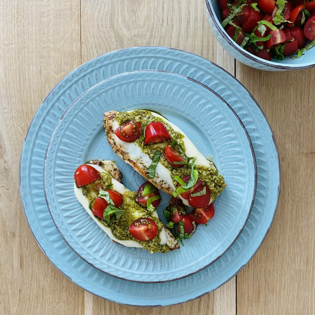 Grillowany kurczak z pomidorkami i pesto bazyliowym.