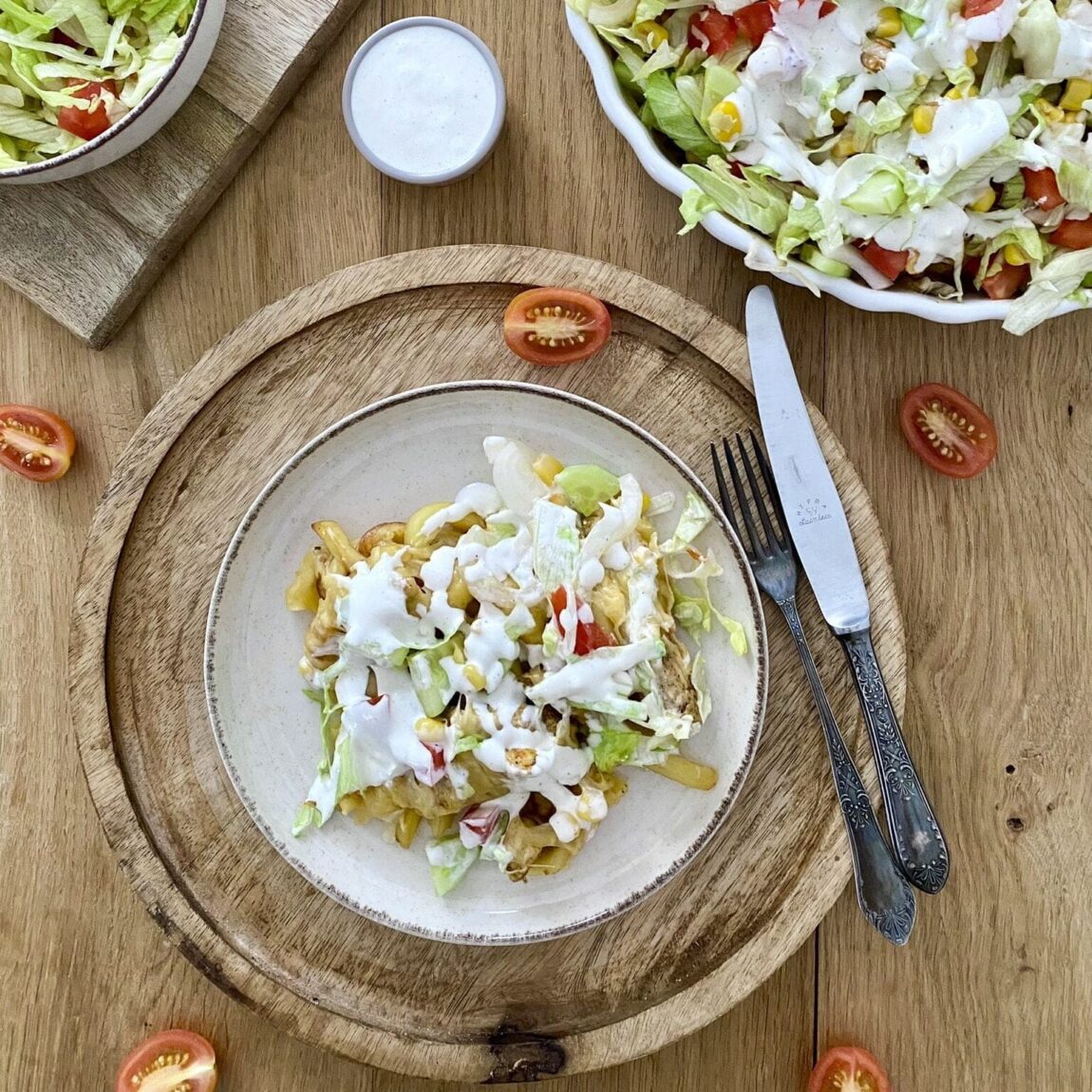 • Przygotuj sałatkę: Pokrój sałatę, ogórka, pomidora, cebulę, dodaj kukurydzę i wymieszaj.