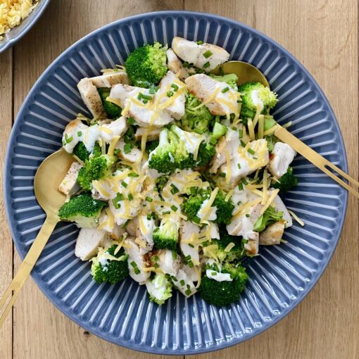 Pyszna i bardzo sycąca sałatka z kurczaka, brokułów i sera cheddar. Całość polana sosem ranczerskim lub cezar.