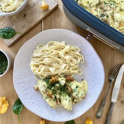 Kawałki kurczaka w kremowym sosie z kurkami i koperkiem