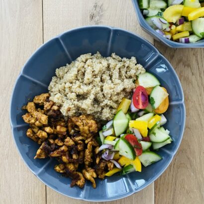 Prosty przepis na pieczonego kurczaka z warzywami podawanego z komosą ryżową.