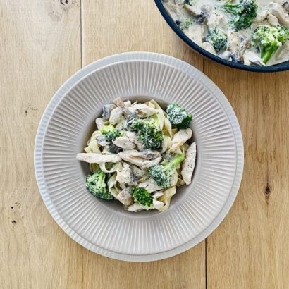 Kurczak w kremowym sosie śmietanowym z brokułami i pieczarkami - najlepiej smakuje z makaronem papardelle i posypany parmezanem.