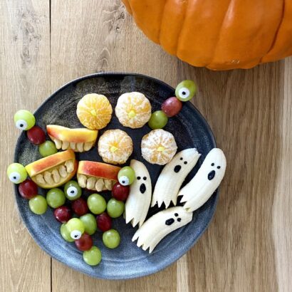 Świetny pomysł na zdrowy i kolorowy talerz smakołyków na halloween dla dzieci.