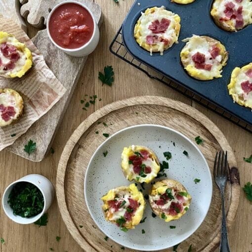 Z dodatkiem szynki i pomidorków koktajlowych.