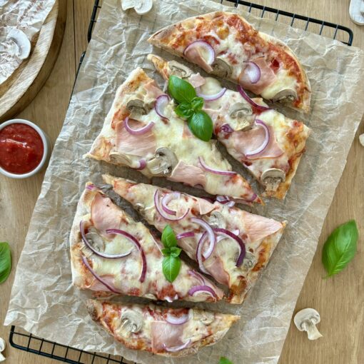 Prosty pomysł na pyszną pinsę z szynką i pieczarkami.