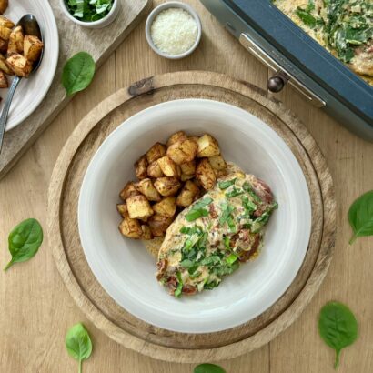 Filety z kurczaka w kremowym sosie z suszonymi pomidorami i dodatkiem pieczonych ziemniaczków.