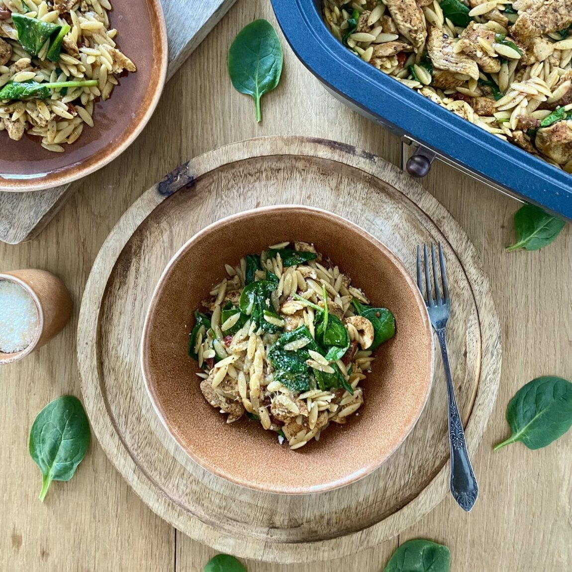 Makaron orzo z kurczakiem, szpinakiem i suszonymi pomidorami to danie pełne smaku. Delikatność makaronu orzo doskonale komponuje się z soczystym kurczakiem, świeżym szpinakiem i intensywnym smakiem suszonych pomidorów. To bardzo szybkie i proste danie, które tworzy prawdziwą ucztę dla podniebienia.
