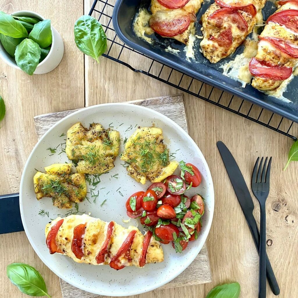 Kurczak a’la caprese to danie inspirowane klasycznym sałatką caprese, której głównymi składnikami są pomidory i mozzarella. W przypadku kurczaka a’la caprese, ponacinane filety z kurczaka są pieczone z plastrami pomidora i mozzarelli. To danie, które łączy w sobie soczystość kurczaka ze smakiem pomidorów i delikatnością mozzarelli, tworząc prawdziwą ucztę dla podniebienia. Kurczak a’la caprese to propozycja dla tych, którzy cenią prostotę i świeżość smaków.