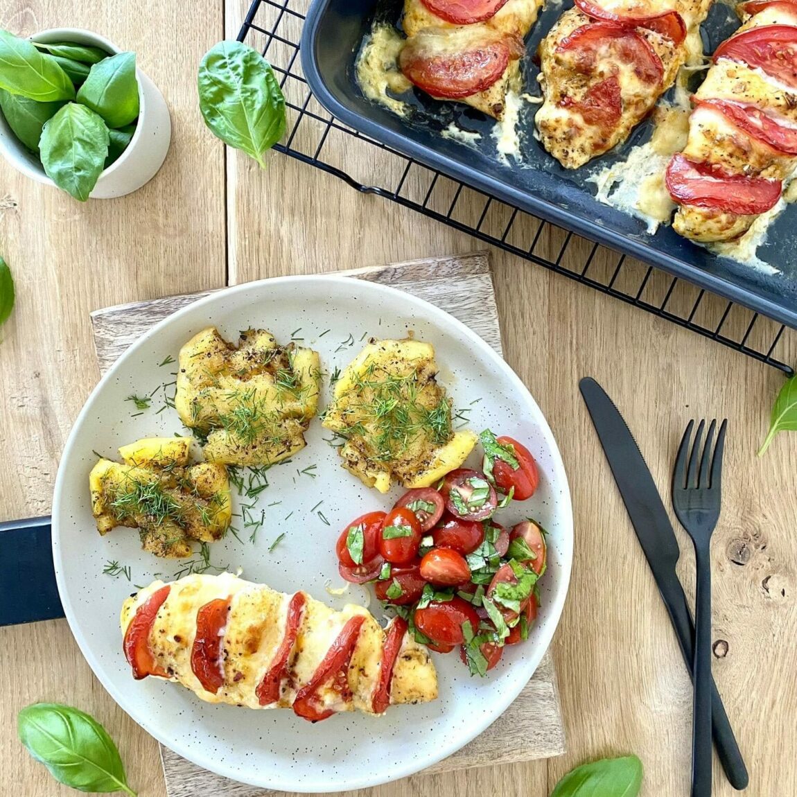 Filety z kurczaka z pomidorami i serem mozzarella.