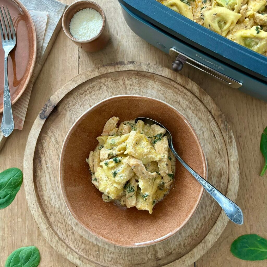 czosnek,  jednogarnkowe,  kurczak,  mięso,  parmezan,  przyjęcia/imprezy,  szpinak,  tortellini,  warzywa