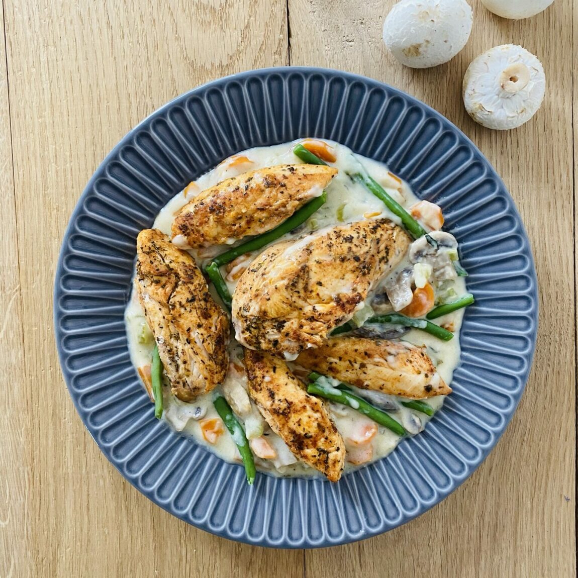 Kurczak fricassee w kremowym sosie z warzywami to wyrafinowane danie, które łączy delikatność kurczaka z bogatym smakiem warzyw i aromatycznego sosu. Kurczak jest duszony w sosie przygotowanym na bazie mleka z dodatkiem marchewki, selera naciowego, pieczarek i fasolki szparagowej. To pyszne danie, które świetnie smakuje podane z ryżem, kluskami lub ziemniakami.