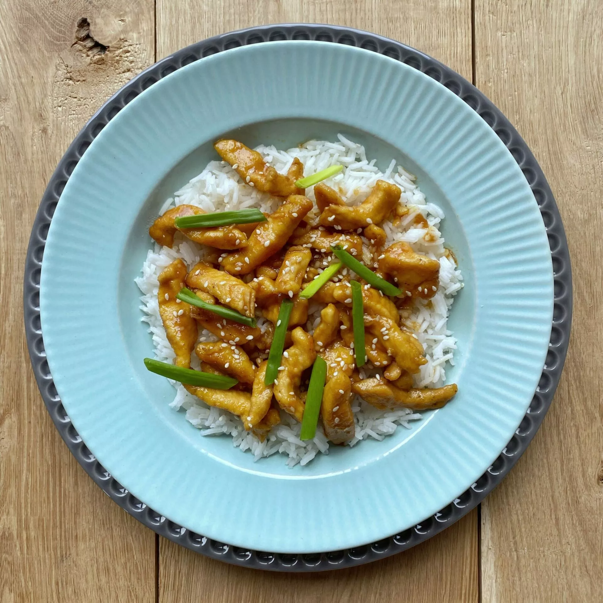 Delikatny i soczysty kurczak w sosie słodko-pikantnym z ryżem.
