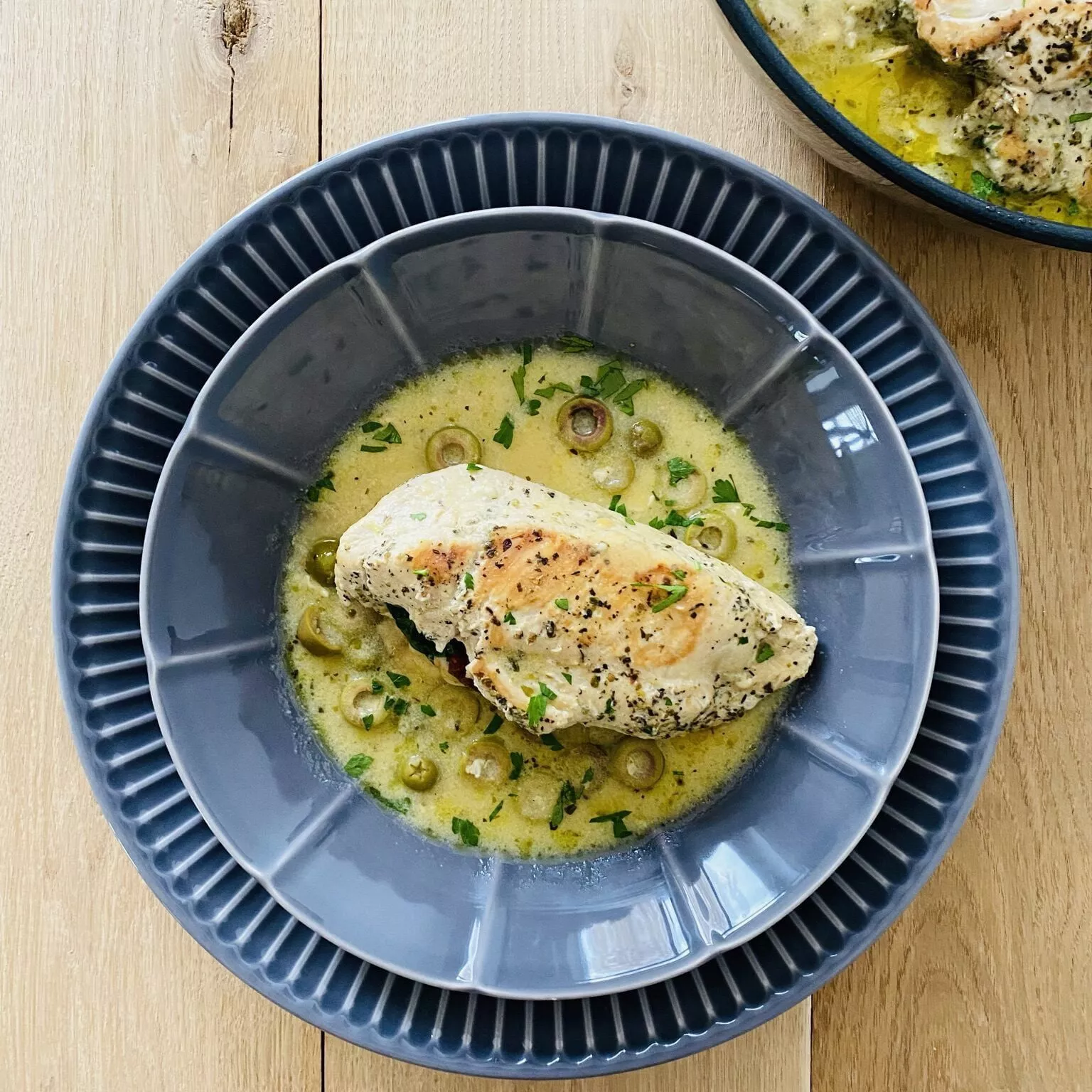 • Dodaj oliwki i włóż kurczaka na patelnię