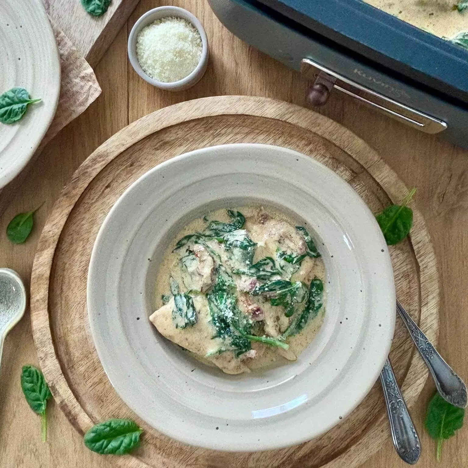 Kurczak w kremowym sosie ze szpinakiem i suszonymi pomidorami