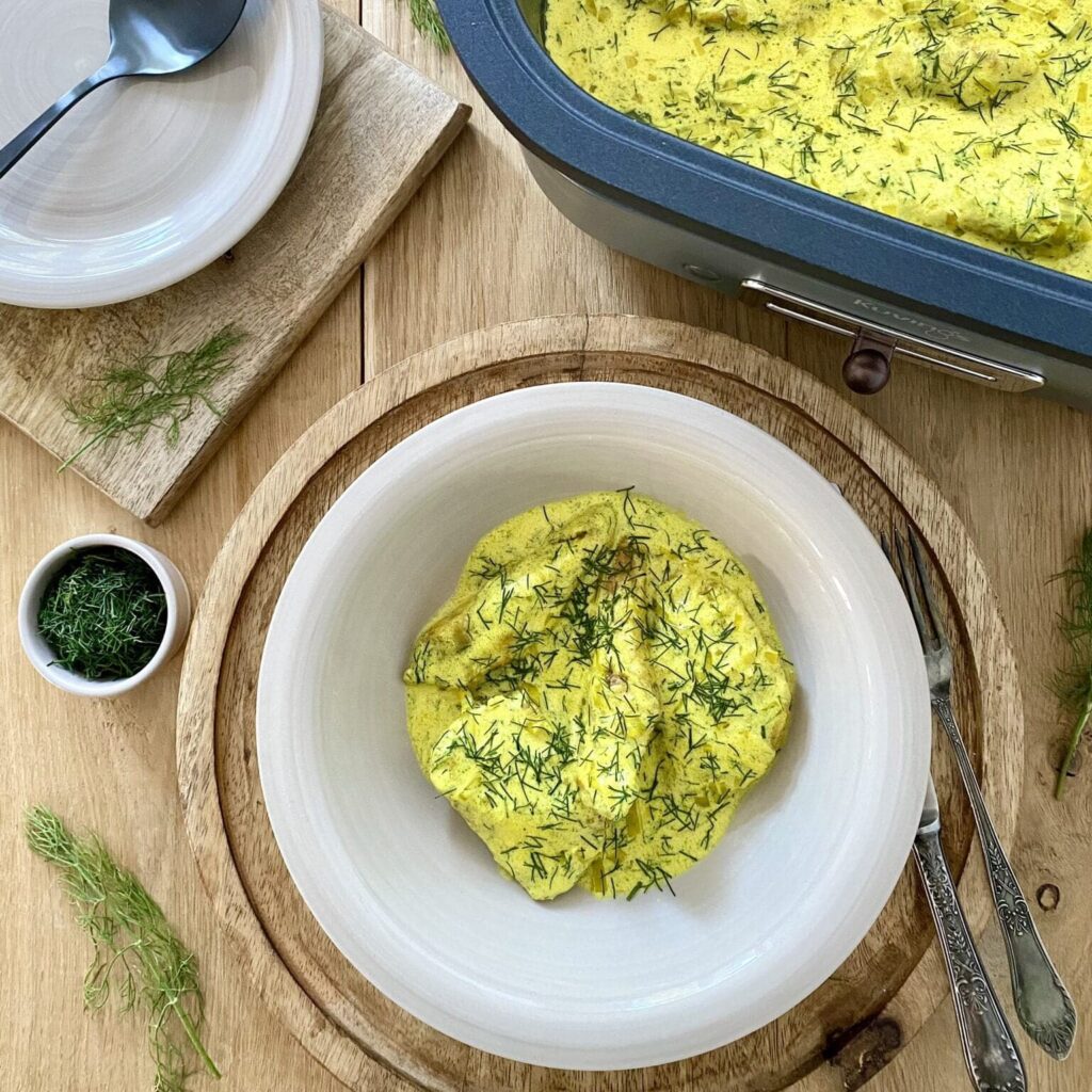 Kawałki kurczaka w kremowym sosie koperkowym.