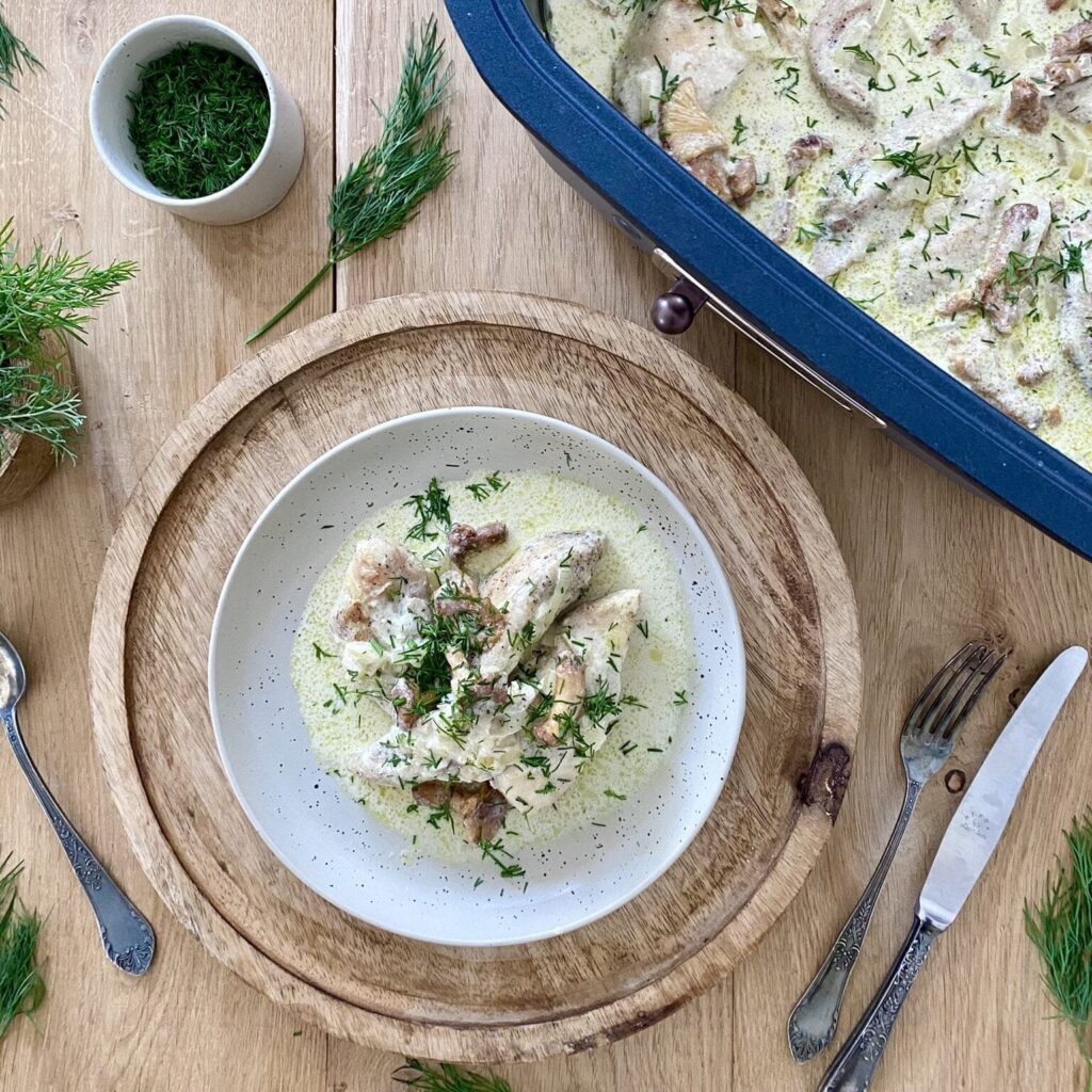 Kawałki kurczaka w kremowym sosie z kurkami i koperkiem