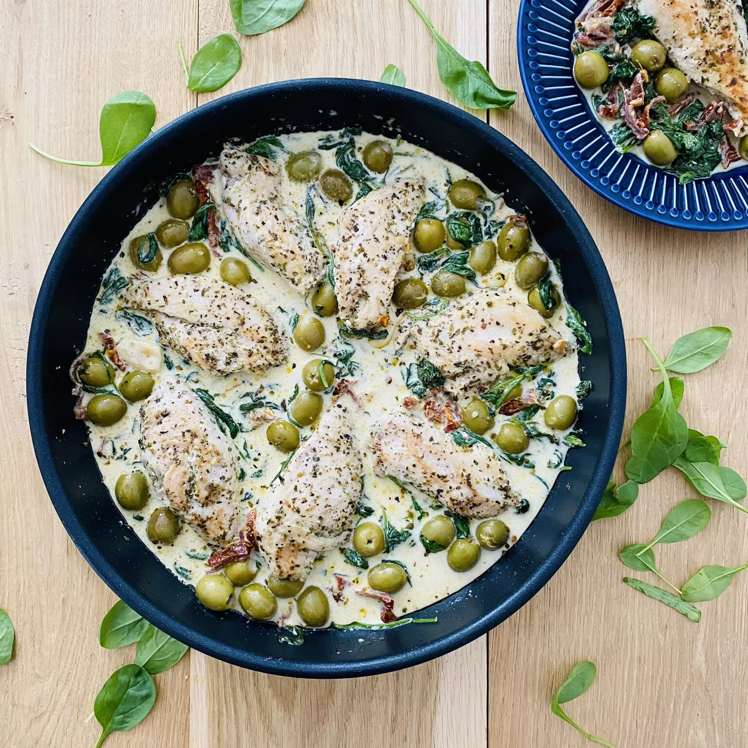 Świetne połączenie smaku delikatnej piersi z kurczaka we włoskich przyprawach ze szpinakiem, suszonymi pomidorami i zielonymi oliwkami.