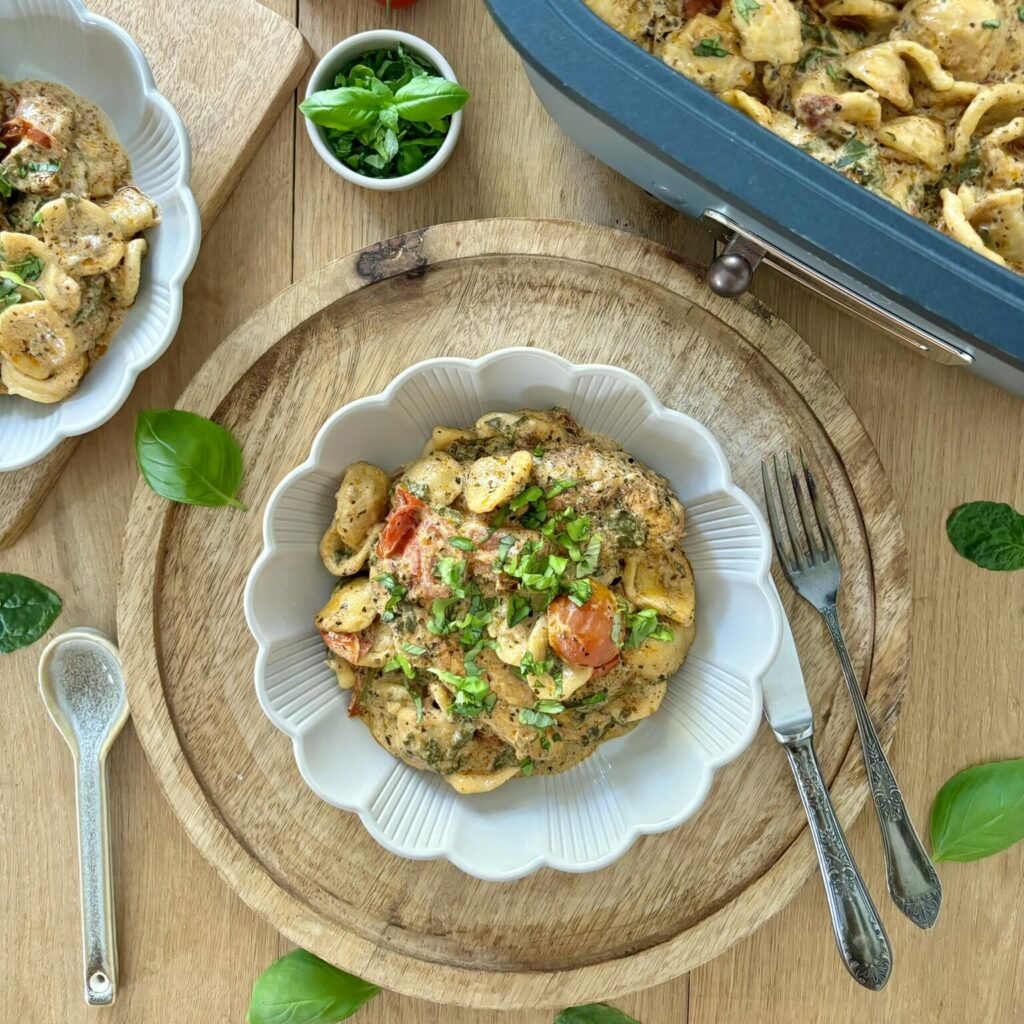 bazylia, jednogarnkowe, kurczak, makarony, mięso, parmezan, pomidorki koktajlowe, przyjęcia/imprezy, suszone pomidory, szpinak, warzywa