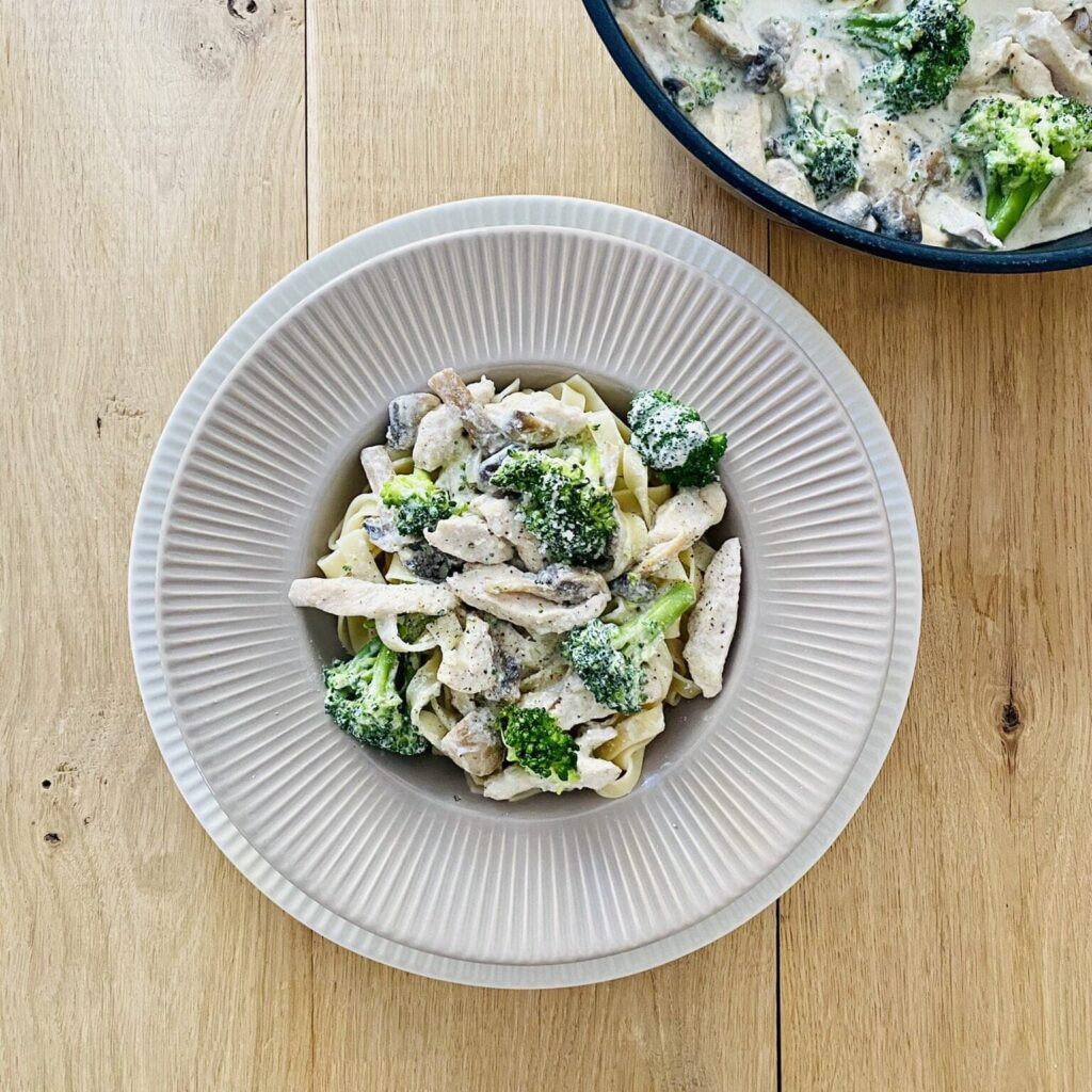 Kurczak w kremowym sosie śmietanowym z brokułami i pieczarkami – najlepiej smakuje z makaronem papardelle i posypany parmezanem.