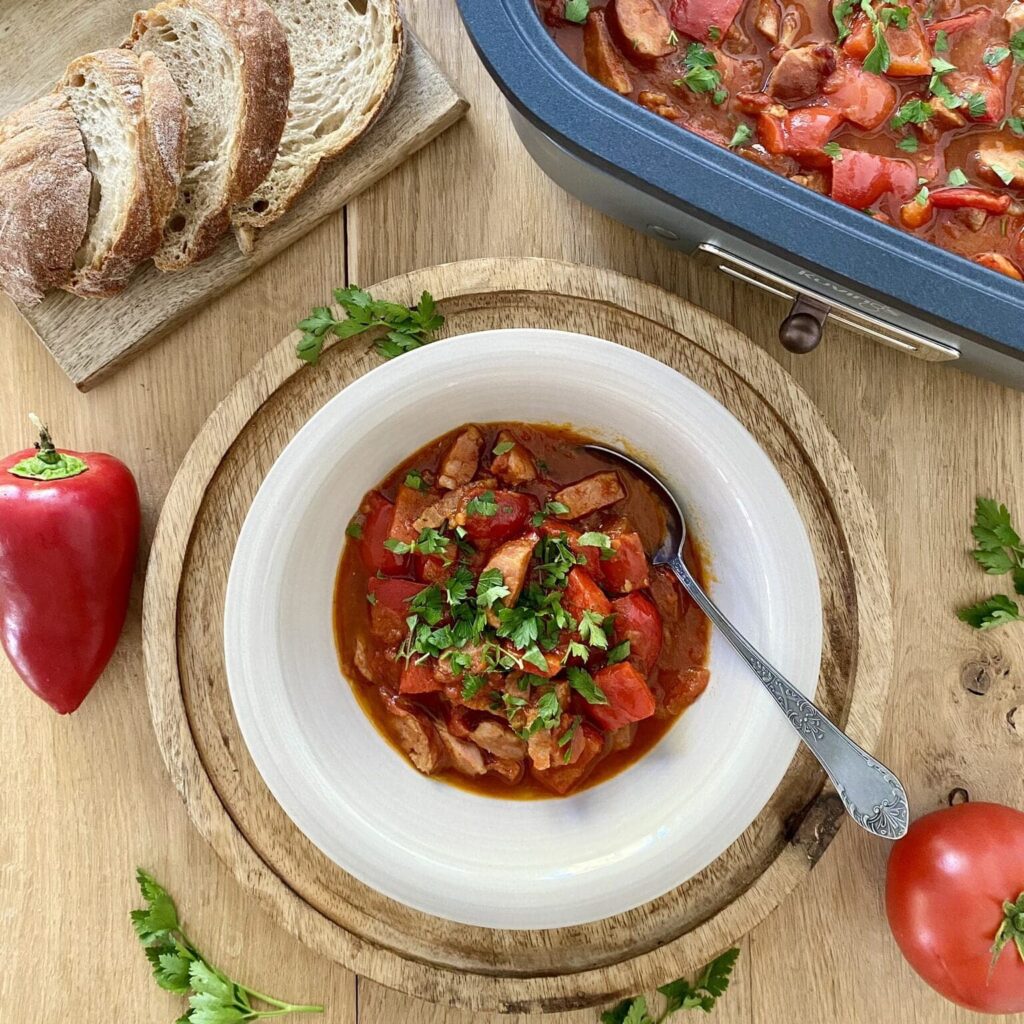 boczek,  cebula,  czosnek,  jednogarnkowe,  kiełbasa,  mięso,  papryka,  pomidory,  warzywa