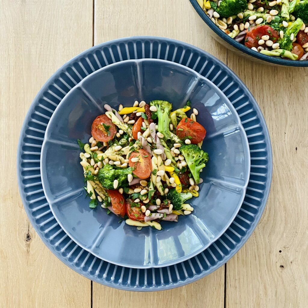 Danie makaronowe z brokułami, pieczonymi pomidorkami koktajlowymi, ziołami i prażonymi orzeszkami pinii.