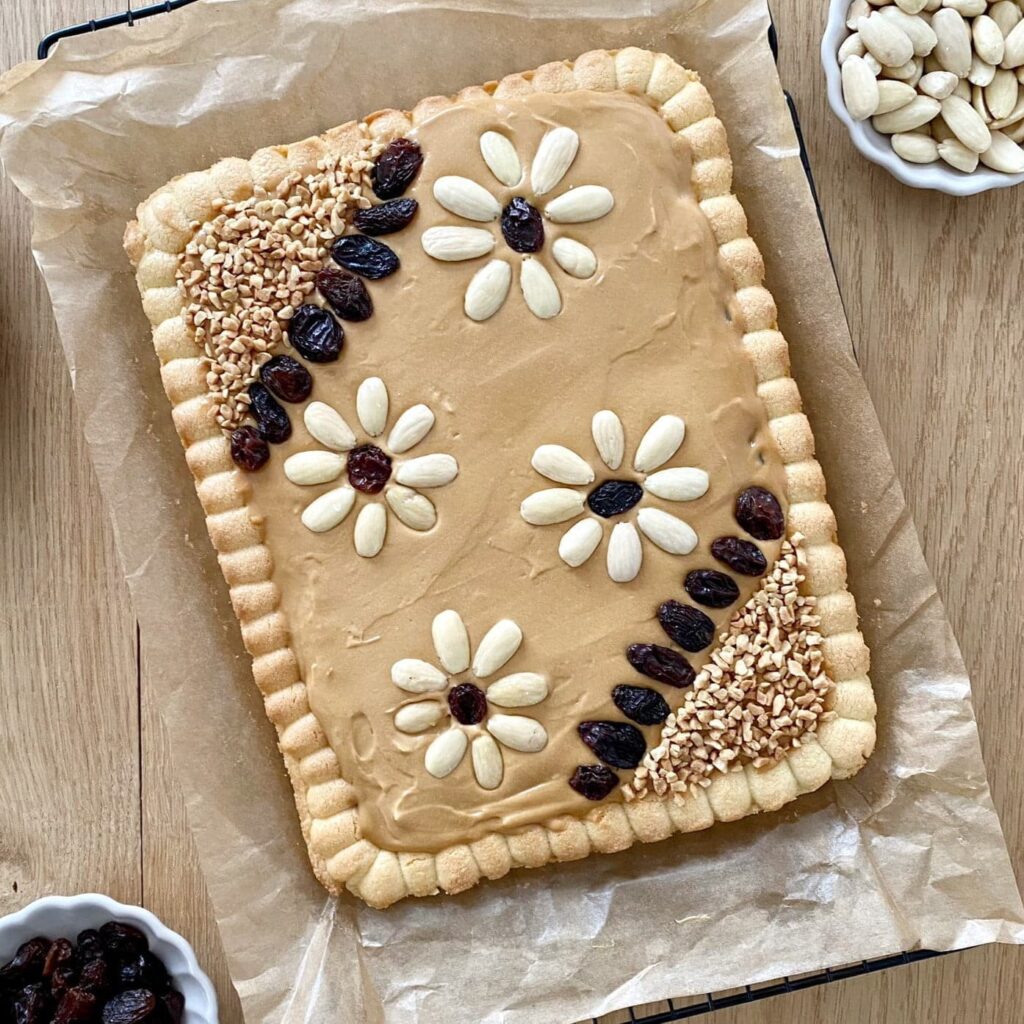 Mazurek to tradycyjne polskie ciasto, które często pojawia się na świątecznych stołach. Charakteryzuje się kruchym spodem, który w tym przepisie jest smarowany powidłami śliwkowymi, a następnie masą kajmakową. Na koniec ciasto jest ozdabiane suszonymi śliwkami orzechami i migdałami. Kombinacja słodkiego kajmaku z lekko kwaśnymi powidłami nadaje temu mazurkowi wyjątkowy smak i aromat. To słodkie danie, które doskonale oddaje polską tradycję cukierniczą i zachwyca nie tylko wyglądem, ale także wyrazistym smakiem.