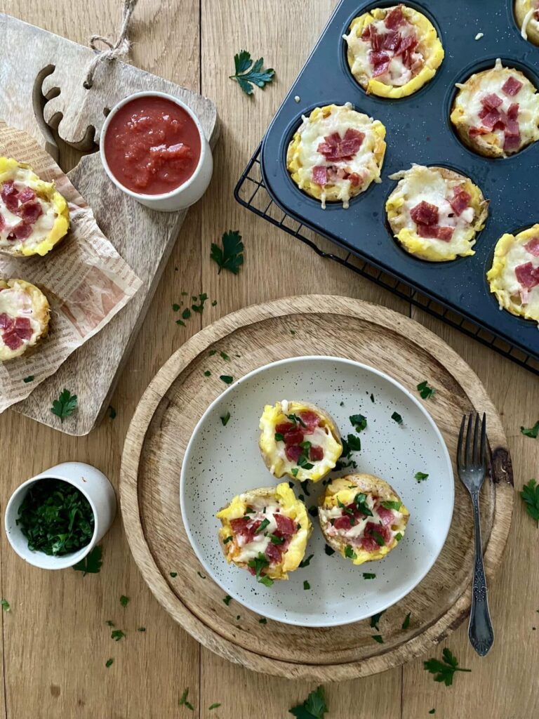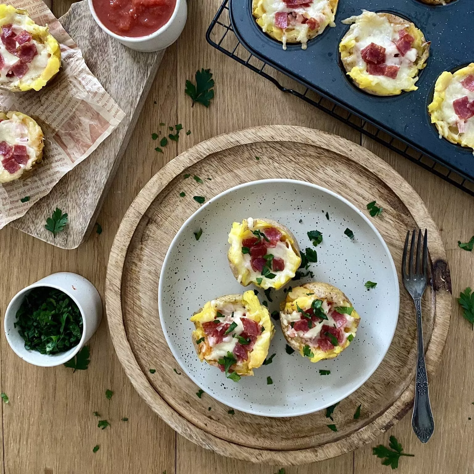 Muffiny ziemniaczane z serem i szynką to oryginalny sposób na wykorzystanie ugotowanych ziemniaków. Dodatek startego sera i pokrojonej w kostkę szynki i salami nadaje im wyjątkowego smaku. Te aromatyczne muffiny idealnie sprawdzają się jako szybka przekąska lub dodatek do obiadu.