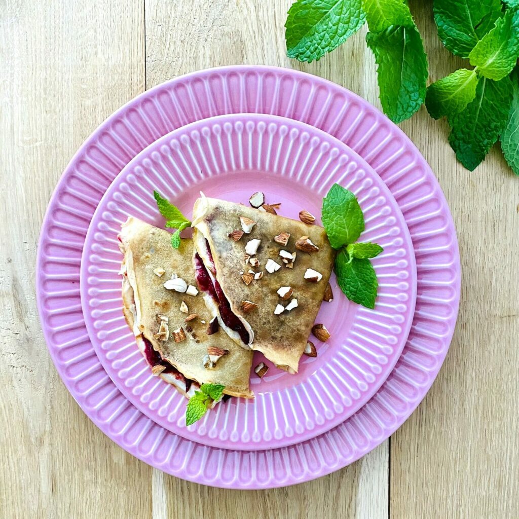Puszyste naleśniki z domowymi powidłami śliwkowymi i podprażonymi migdałami.