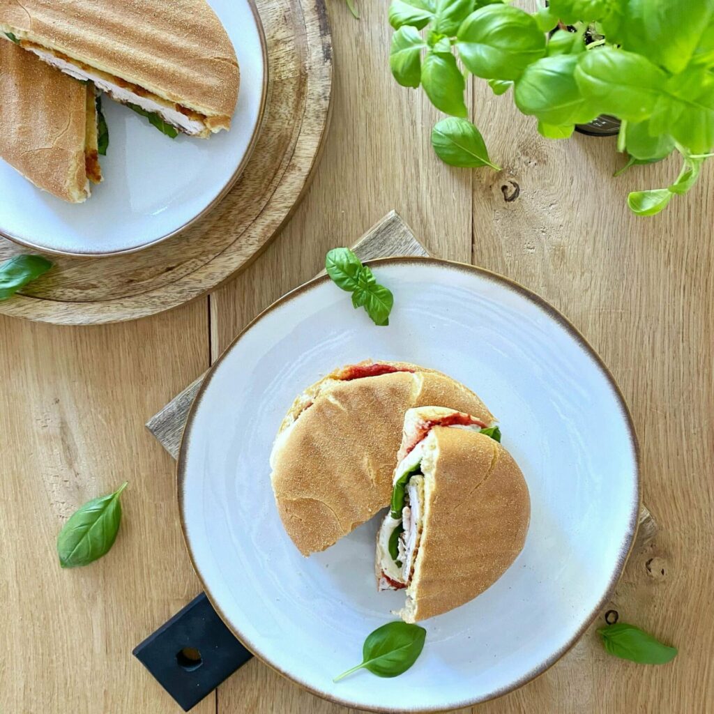 Zapiekane panini z kurczakiem, mozzarellą i bazylią.