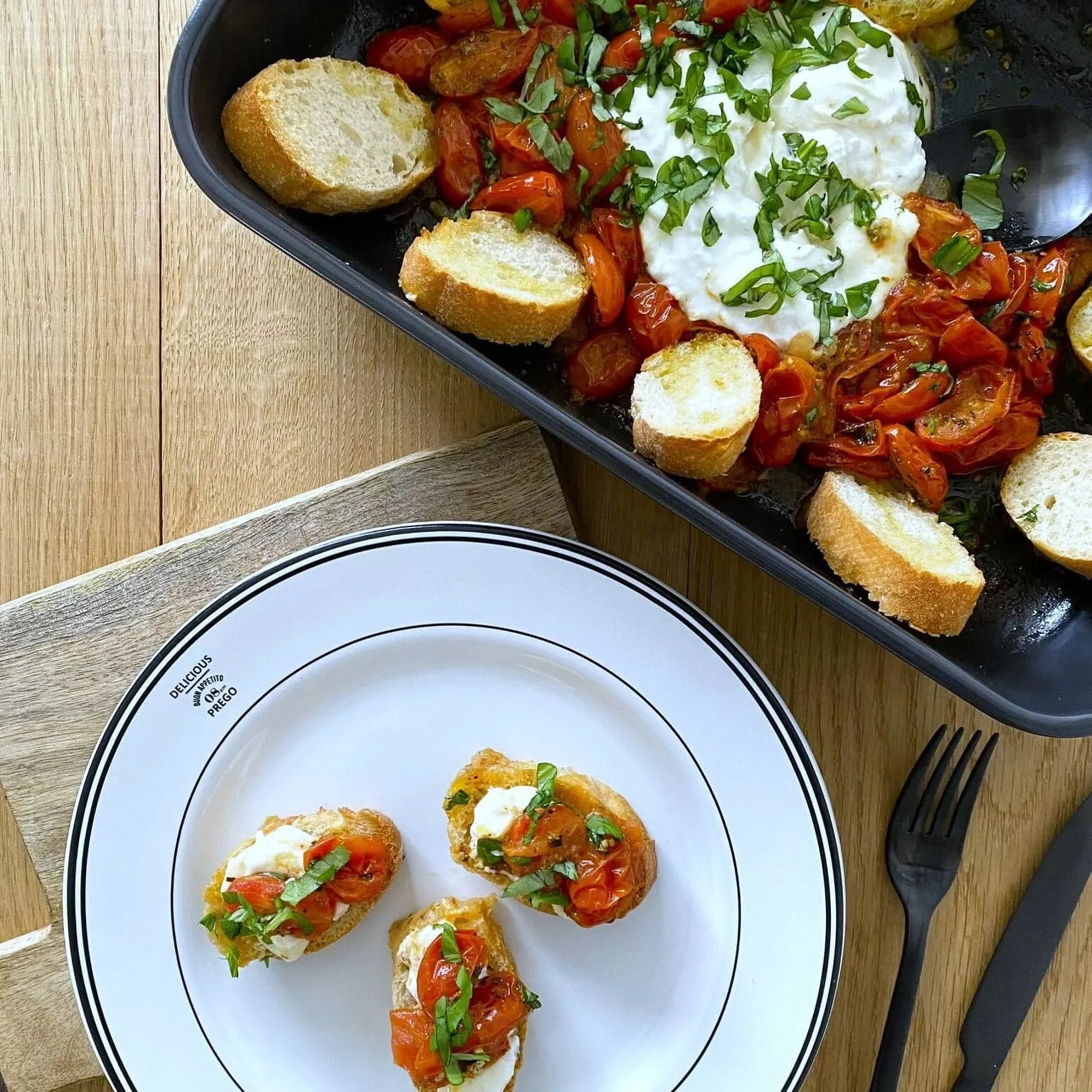 czosnek, grzanki i tosty, pomidorki koktajlowe, przyjęcia/imprezy, ser burrata, śniadania, z piekarnika