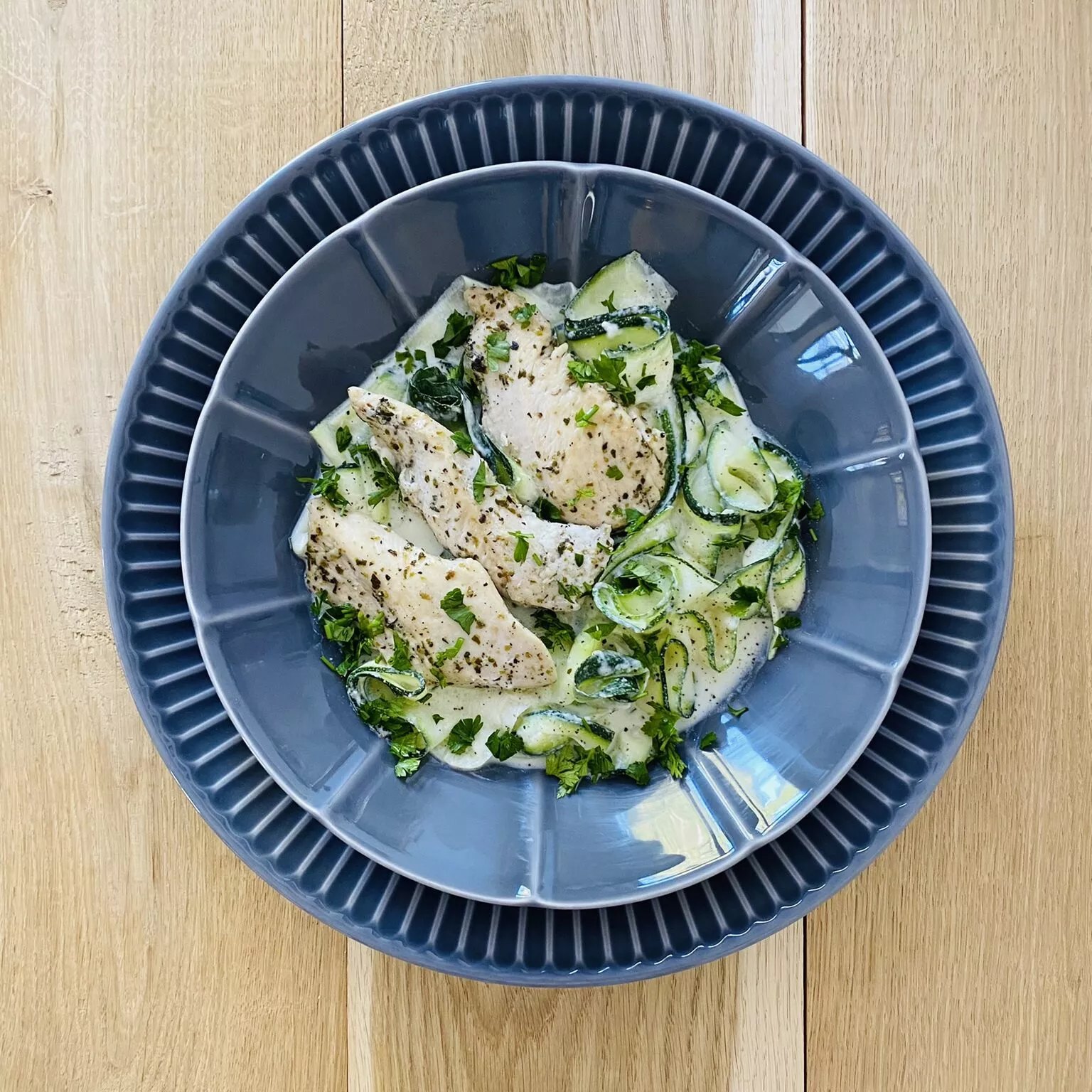 Makaron z cukinii z kurczakiem we włoskich przyprawach.