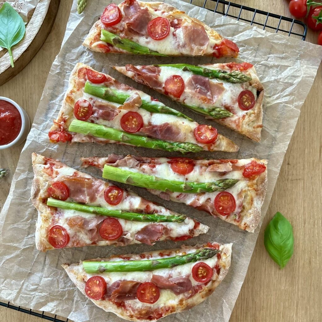pizza / pinsa, pomidorki koktajlowe, przyjęcia/imprezy, ser mozzarella, szparagi, szynka parmeńska / prosciutto, z piekarnika