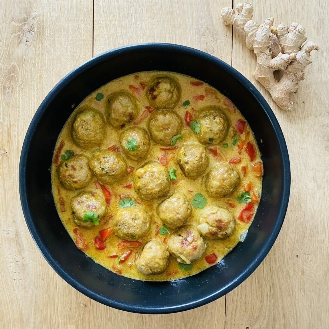 - Jak tylko klopsiki się upieką, dodaj je do sosu curry.