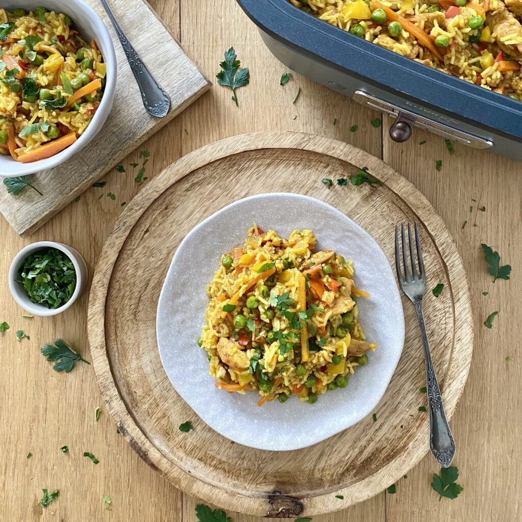 Ryż z kurczakiem i warzywami to pożywna i kolorowa potrawa, która zachwyca różnorodnością smaków i tekstur. Soczyste kawałki kurczaka, ryż basmati, chrupiąca marchewka, słodka papryka i zielony groszek tworzą sycące danie, który zaspokoi głód i dostarczy niezbędnych składników odżywczych. To prosty i szybki przepis, który idealnie sprawdzi się na obiad lub kolację dla całej rodziny.