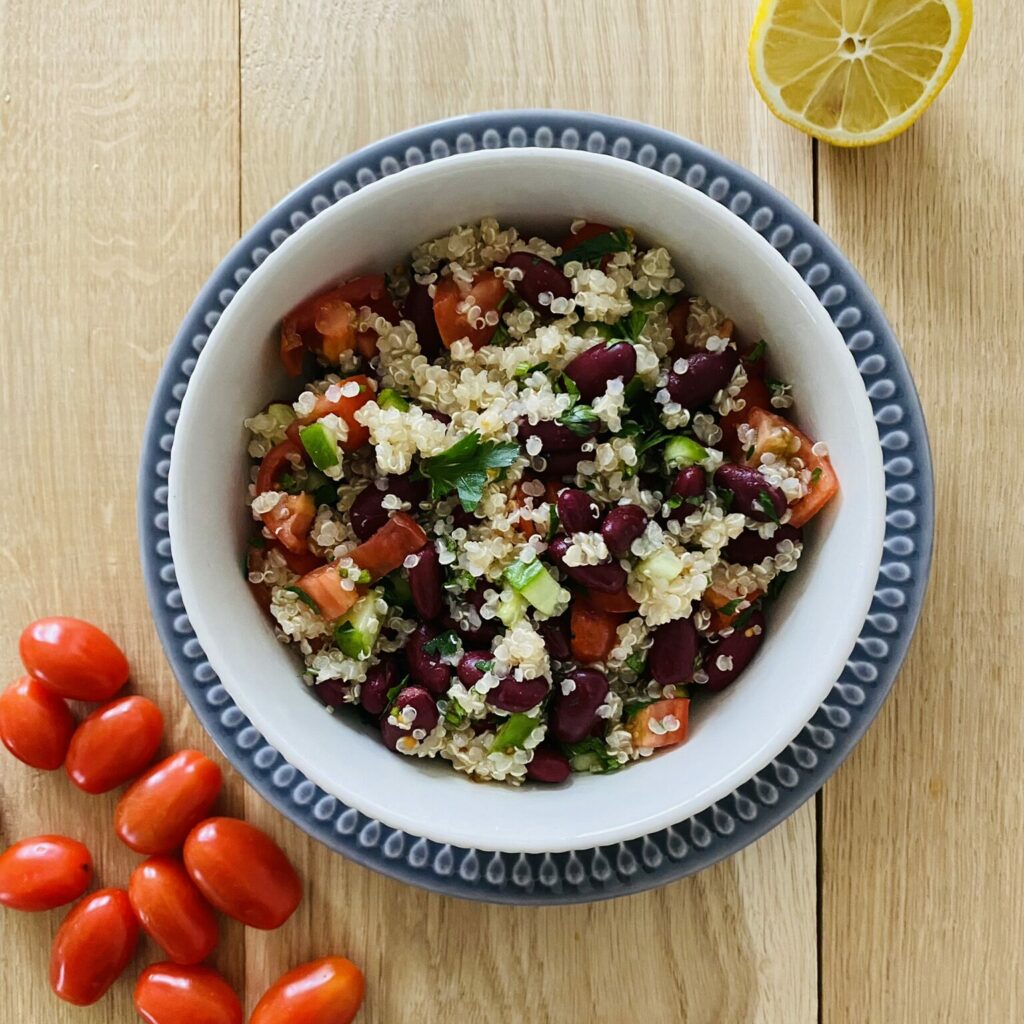 Sałatka tabbouleh z komosą ryżową, czarną fasolą, pomidorkami, ogórkiem i pietruszką to lekka i pożywna potrawa, idealna na letnie dni. Komosa ryżowa jest bazą dania, czarna fasola wzbogaca o białko, a świeże warzywa nadają świeżości. Sok z cytryny i oliwa z oliwek nadają wyjątkowego smaku, tworząc harmonijne połączenie. To proste danie zaspokoi nie tylko apetyt, ale i dostarczy ważnych składników odżywczych.