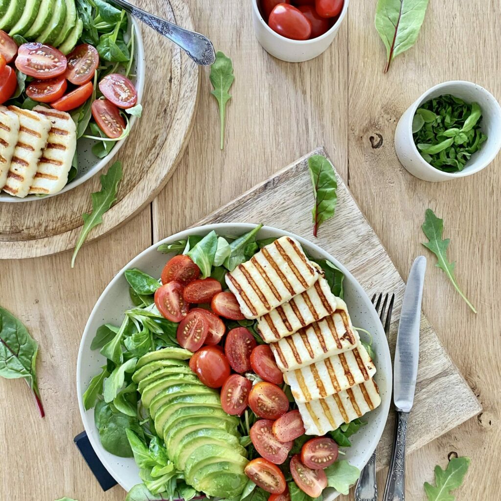 - Nakładaj na talerzu: rukolę, roszponkę, pokrojone awokado, pomidorki i zgrillowany ser halloumi.