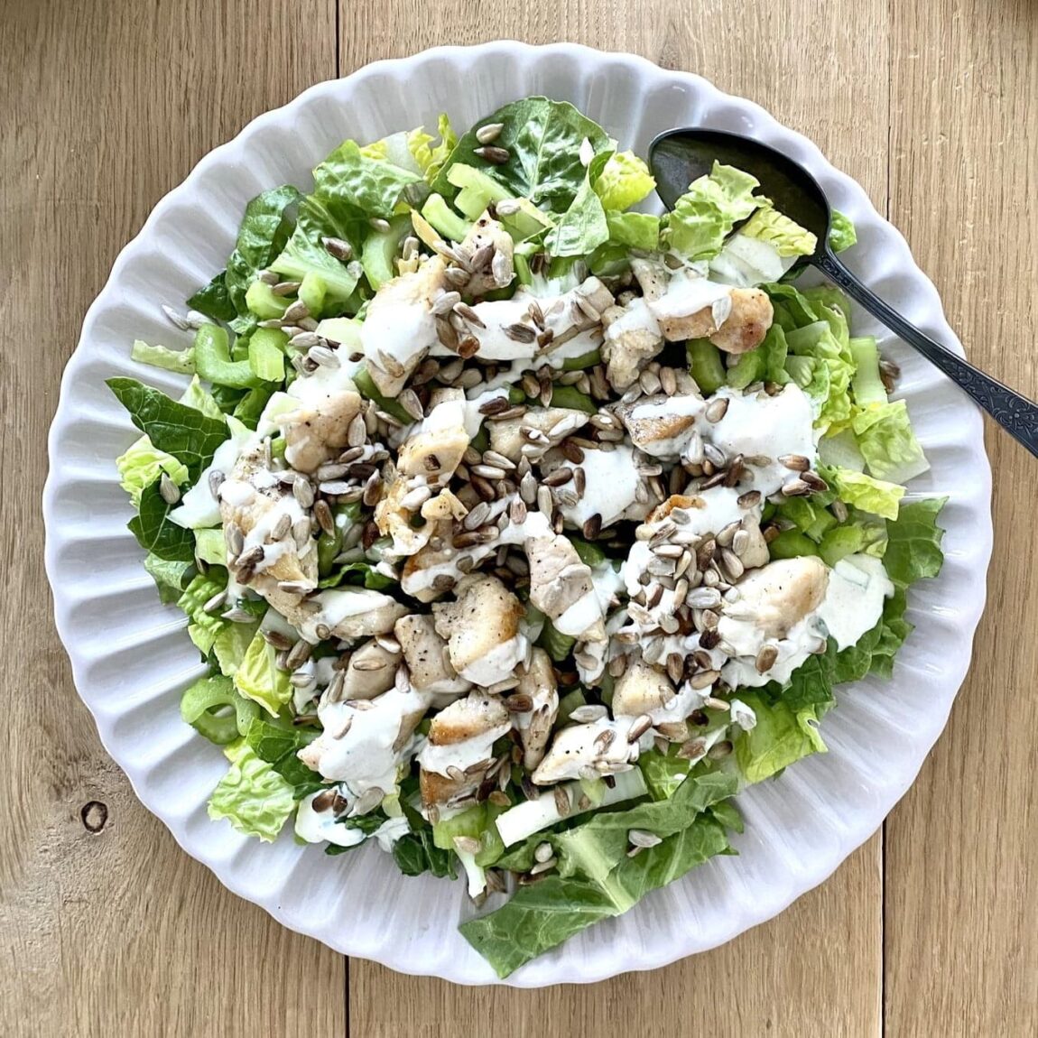 Niesamowicie chrupiąca i sycąca sałatka z jarmużu, selera i kurczaka z dodatkiem słonecznika. Całość polana aromatycznym sosem.