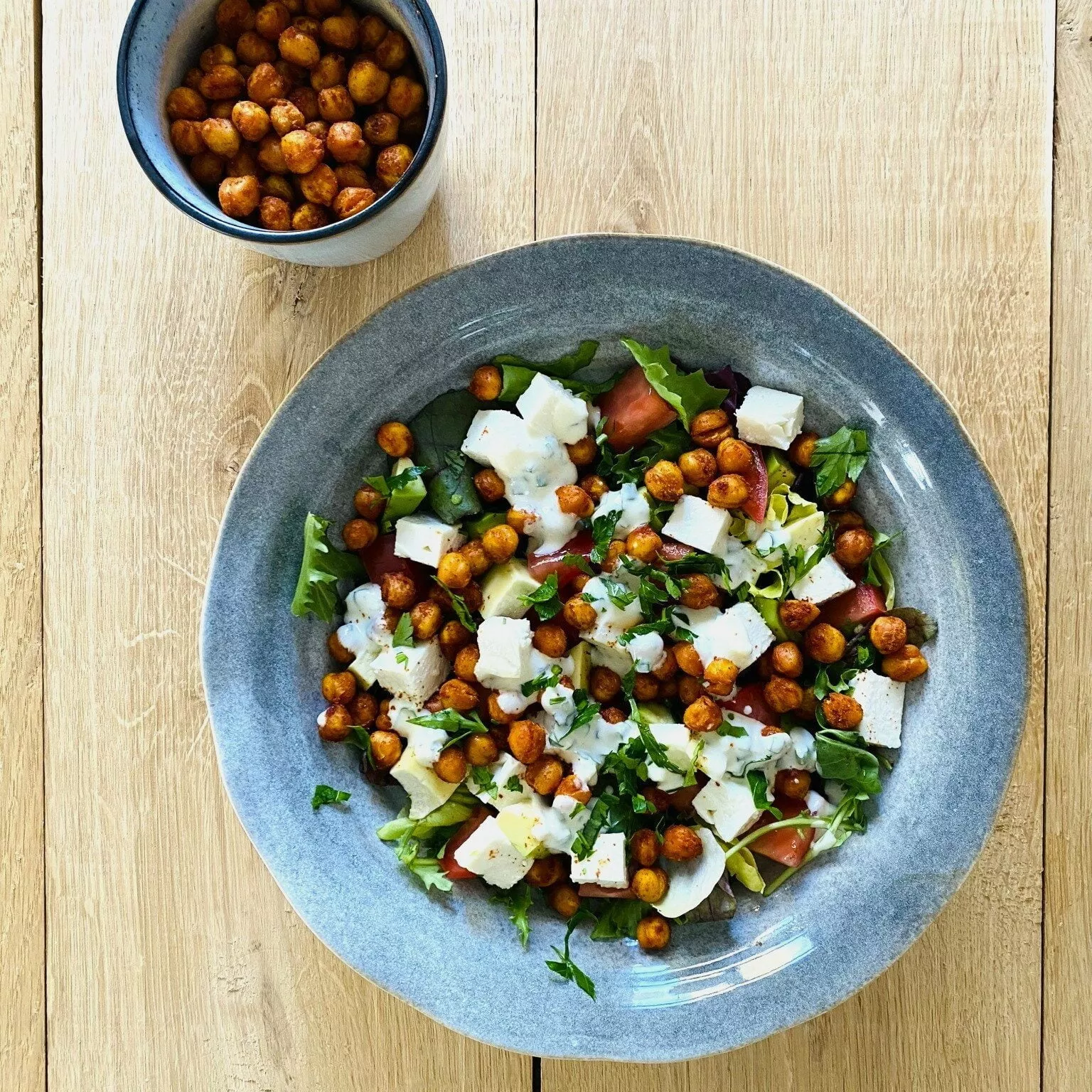 Sałatka z pieczoną ciecierzycą, świeżymi warzywami i serem feta to połączenie różnorodnych smaków i tekstur, które tworzą wyjątkową i pożywną potrawę. Pieczona ciecierzyca dodaje chrupkości i aromatu, łącząc się z delikatną sałatą oraz soczystymi pomidorami. Dodatek kremowego awokado nadaje sałatce wyjątkowej konsystencji i świeżości. Posiekana pietruszka dodaje ziołowego akcentu, a kruszony ser feta intensyfikuje smak dania. To lekka i smaczna sałatka, idealna jako zdrowy posiłek na letnie dni.