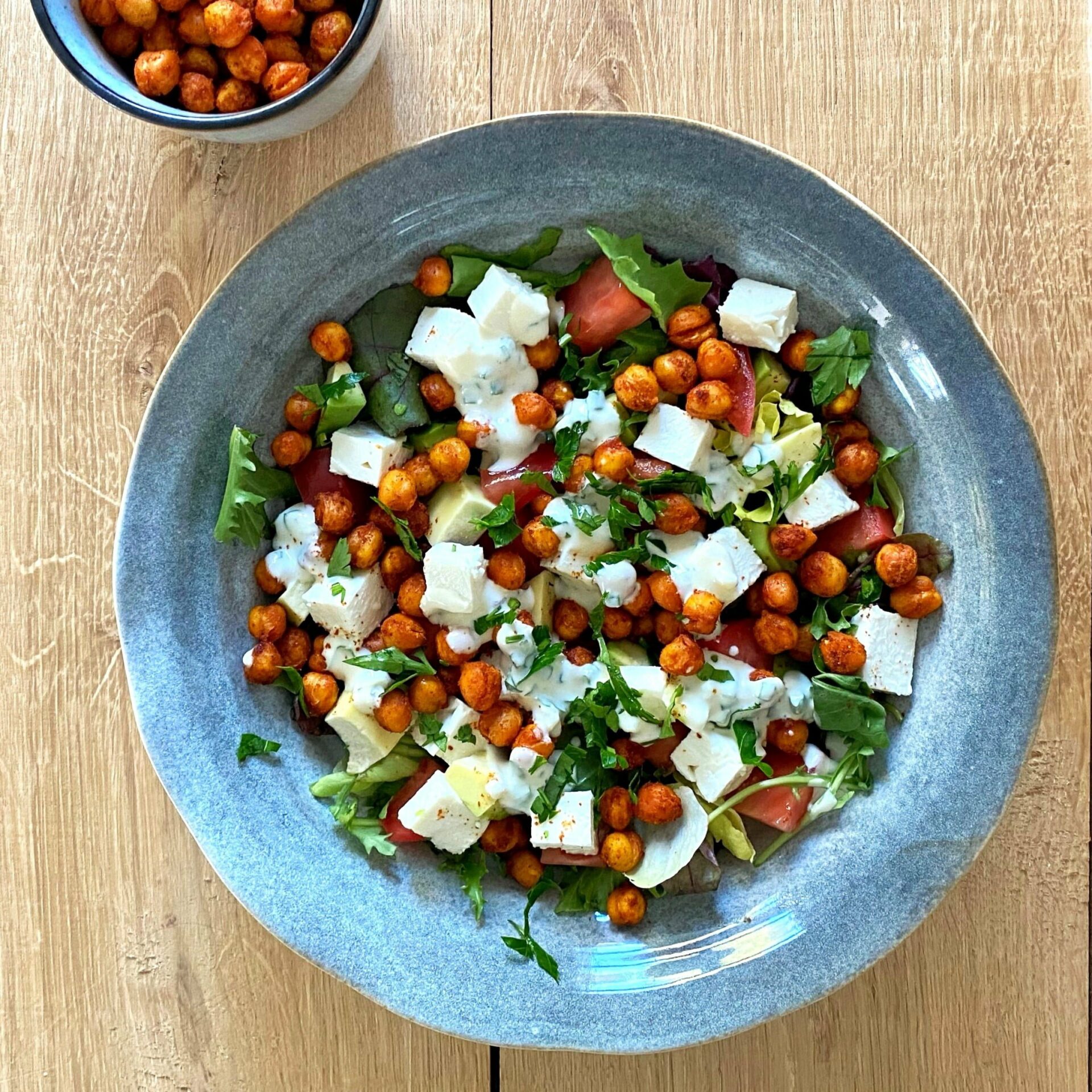 - Przygotuj sałatkę: na miskę wyłóż pokrojoną sałatę, pomidory, awokado, ser feta, pieczoną ciecierzycę i polej dressingiem.