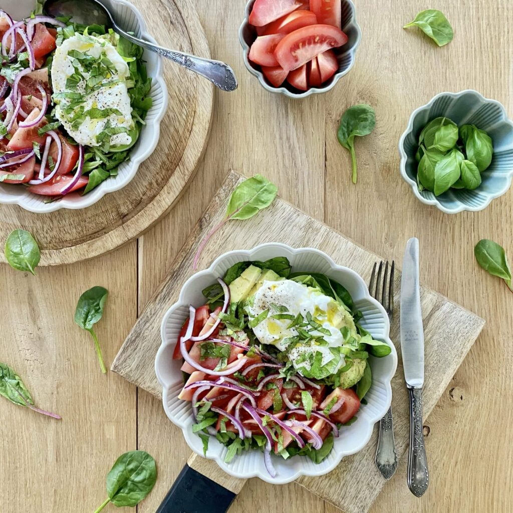 Pomidorowa sałatka z awokado i serem burrata.